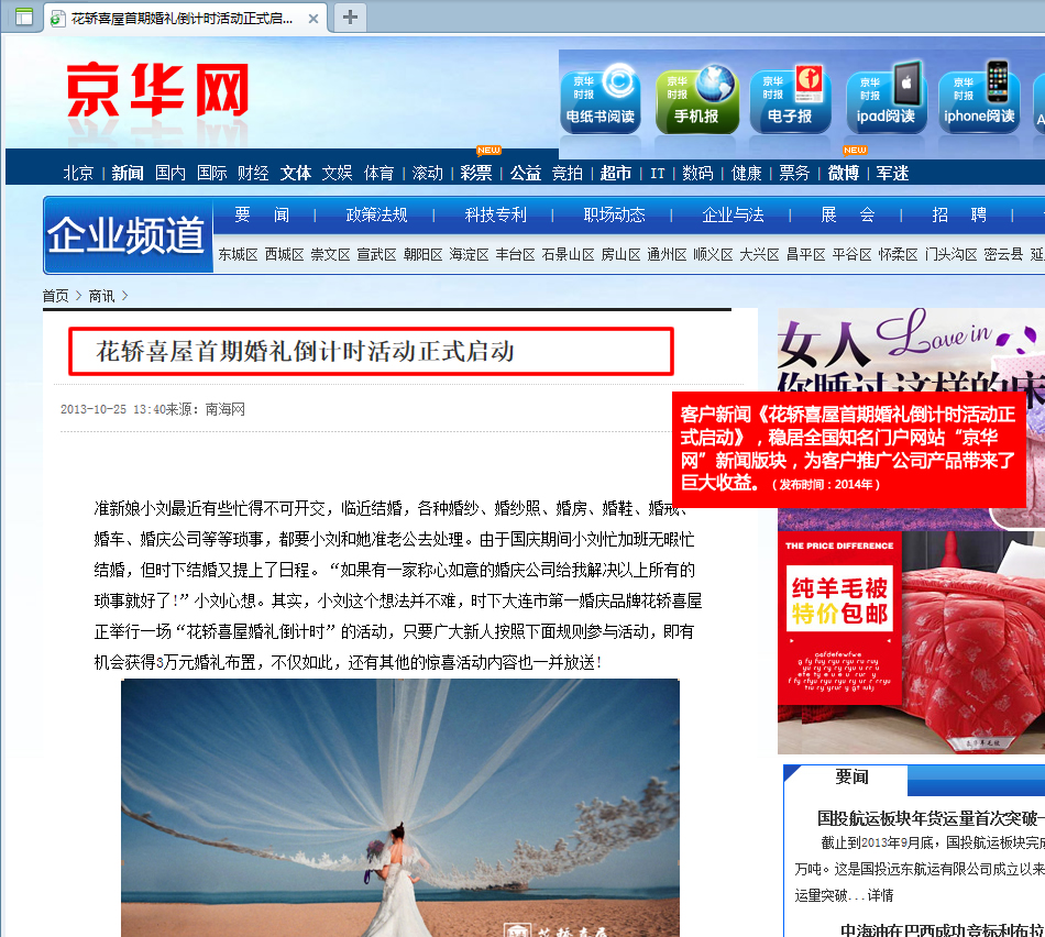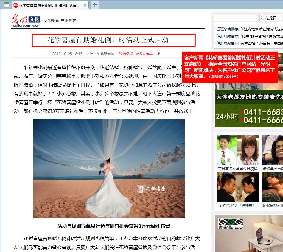 我公司為“花轎喜屋”大連喜客文化公司策劃軟文“花轎喜屋首期婚禮倒計時活動正式啟動”,并發(fā)布在如下幾十家全國媒體,給客戶產(chǎn)品推廣帶來了巨大的收益。搜狐大連、東北新聞網(wǎng)、中國廣播網(wǎng)、中華網(wǎng)、光明網(wǎng)、京華網(wǎng)、金羊網(wǎng)、中國網(wǎng)、新民網(wǎng)、中國日報、晨網(wǎng)、中國山東網(wǎng)、華東在線、南海網(wǎng)、呂梁網(wǎng)、南方企業(yè)新聞、中國企業(yè)新聞、現(xiàn)代生活網(wǎng)、生活周刊、華夏生活網(wǎng)、中國服裝品牌、時間網(wǎng)、浙江在線、海外網(wǎng)、遼寧縣域經(jīng)濟。