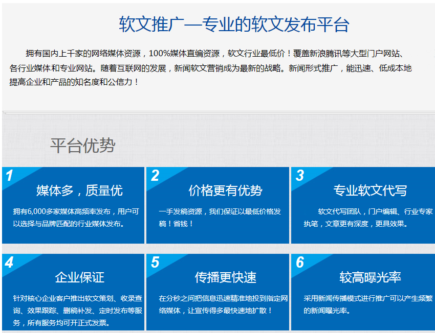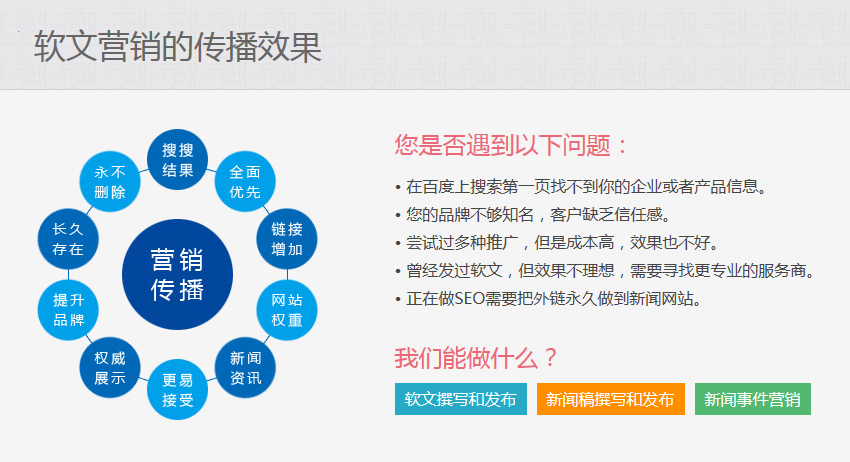 為客戶指導(dǎo)、策劃、撰寫軟文,并發(fā)布在如新浪、網(wǎng)易、大連電視臺等數(shù)幾十家全國知名媒體,給客戶企業(yè)形象及產(chǎn)品推廣帶來了巨大的品牌效應(yīng)、知名度、美譽度。