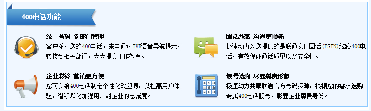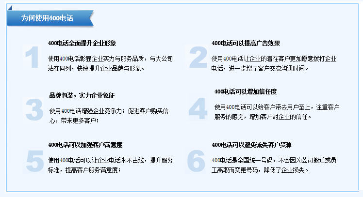 400電話是塑造企業(yè)形象不可或缺的標(biāo)志,客戶通常認(rèn)為擁有400電話的企業(yè)是具有一定規(guī)模,有一定運營實力的企業(yè)。企業(yè)將400號碼用在于宣傳頁、名片、廣告中可大大提升企業(yè)形象,與行業(yè)龍頭并駕齊驅(qū)。對提升客戶信任度等諸多方便非常有利。且免異地長話費,更利于異地客戶撥打咨詢。