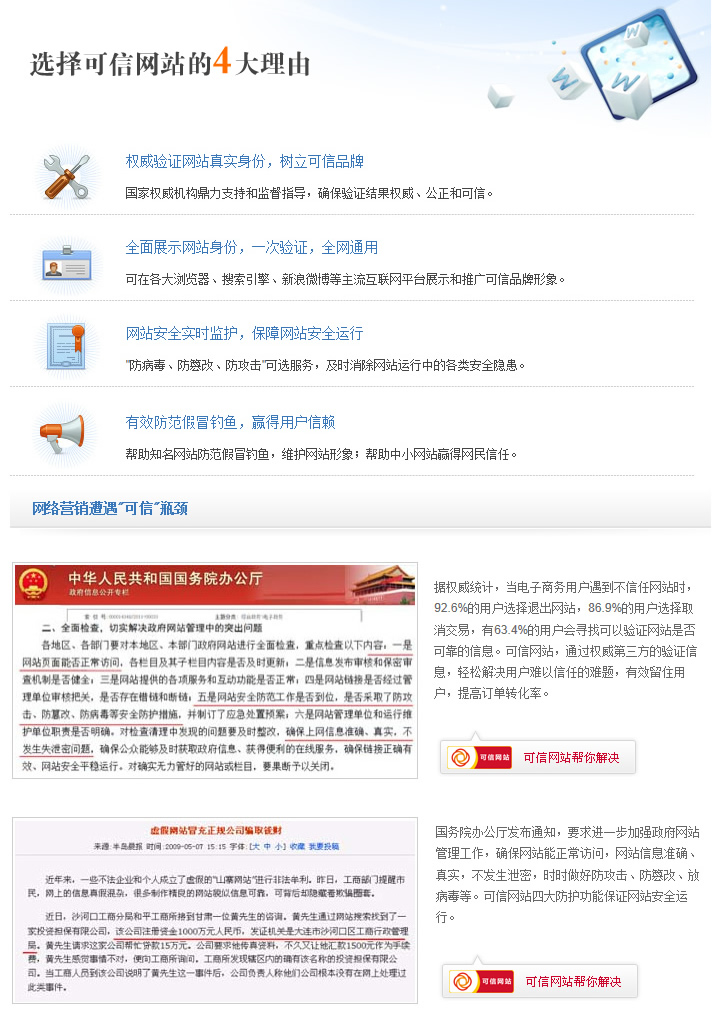 ■ 網(wǎng)站一次驗證,結果全網(wǎng)通用:兩大權威數(shù)據(jù)庫共同收錄;主流瀏覽器全面收錄和展示;主流搜索引擎全面引用和展示;安全軟件、微博平臺全面支持;