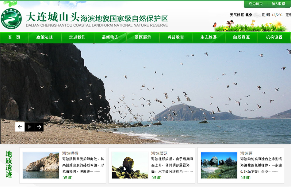 大連城山頭海濱地貌國(guó)家級(jí)自然保護(hù)區(qū)位于大連市金州新區(qū)大李家鎮(zhèn)東南沿海。西起正明寺的草坨子,東至城子村的城山頭(包括鴛鴦石-蛋坨子),北自扁擔(dān)山、磨盤(pán)山山脊,南至海岸線向海面延伸500m的海域。其中核心區(qū)面積為210公頃、緩沖區(qū)80公頃、實(shí)驗(yàn)區(qū)1060公頃,主要的保護(hù)對(duì)象是珍貴的海濱巖溶地貌和珍稀的鳥(niǎo)類(lèi)資源。