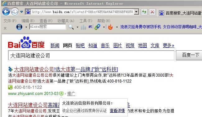 中國權(quán)威搜索引擎百度日前對網(wǎng)上宣傳的商業(yè)網(wǎng)站進(jìn)行了身份認(rèn)證,以提高訪問者對網(wǎng)站可靠度的可識別性,打擊互聯(lián)網(wǎng)欺詐與虛假宣傳行為。在搜索結(jié)果中,網(wǎng)址前面有小“綠盾”圖標(biāo)的則為通過百度官方認(rèn)證的網(wǎng)站。