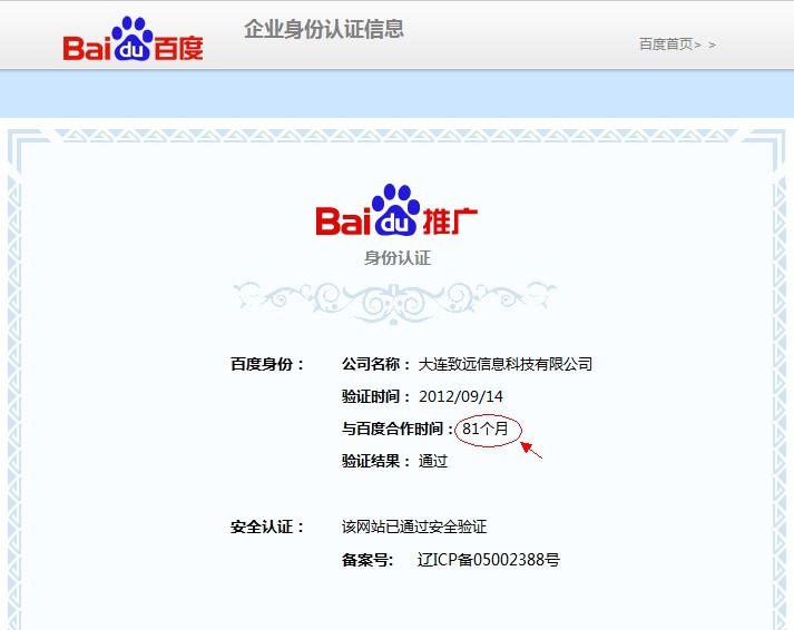 在認(rèn)證結(jié)果中,百度還提供了被認(rèn)證企業(yè)與百度的合作時間,這也是一個極為重要的信息。常言道,“時間能夠證明一切!”。如被認(rèn)證企業(yè)與百度已合作多年,證明其行業(yè)歷史真實,實力雄厚、經(jīng)營穩(wěn)健持久,具有更高的經(jīng)營穩(wěn)定度和可靠性。
