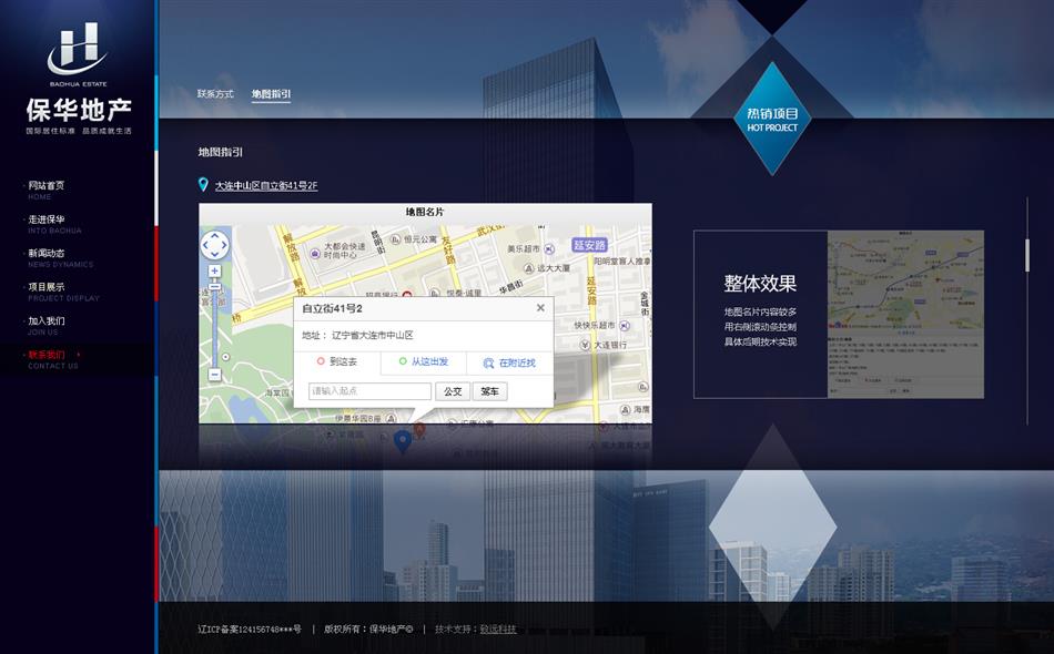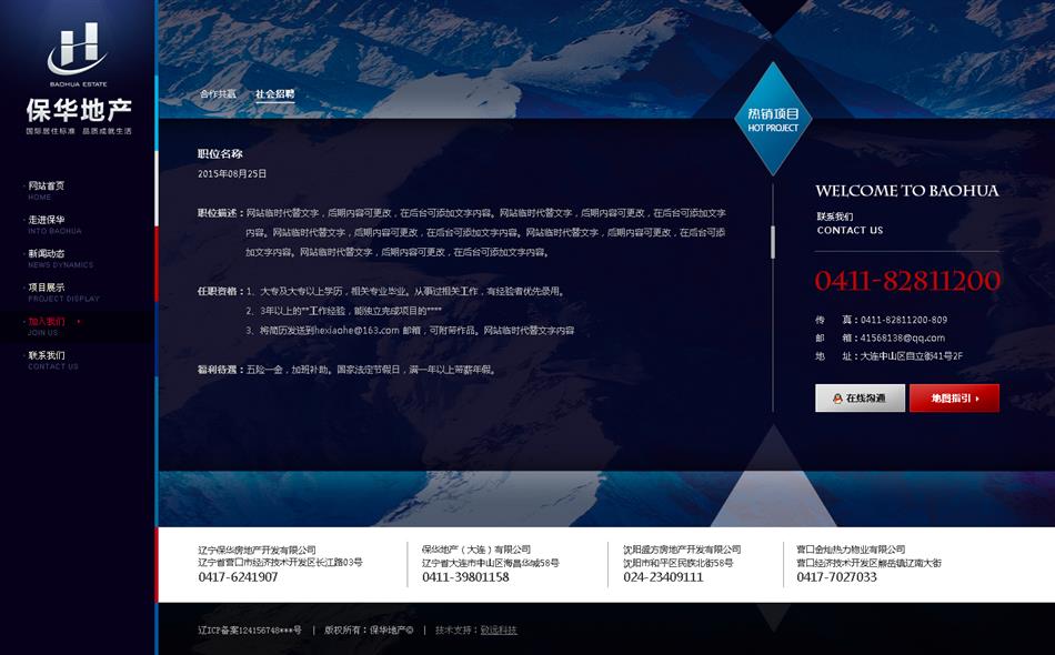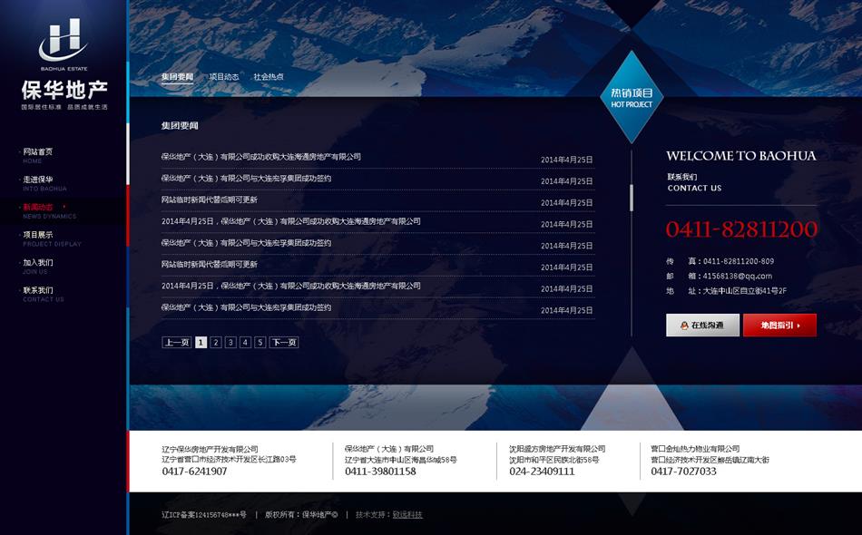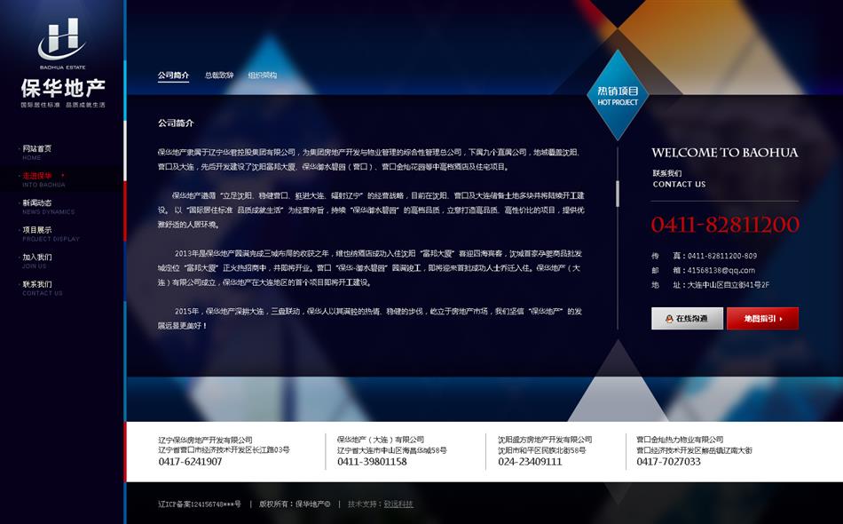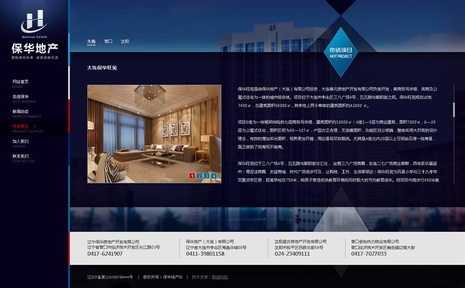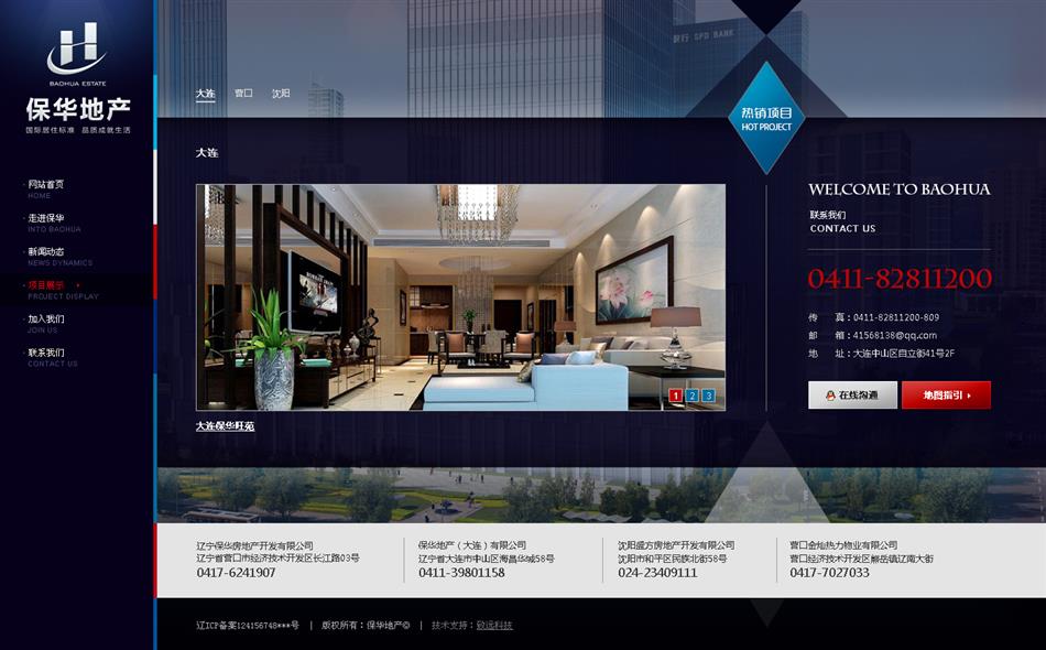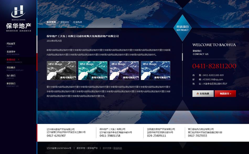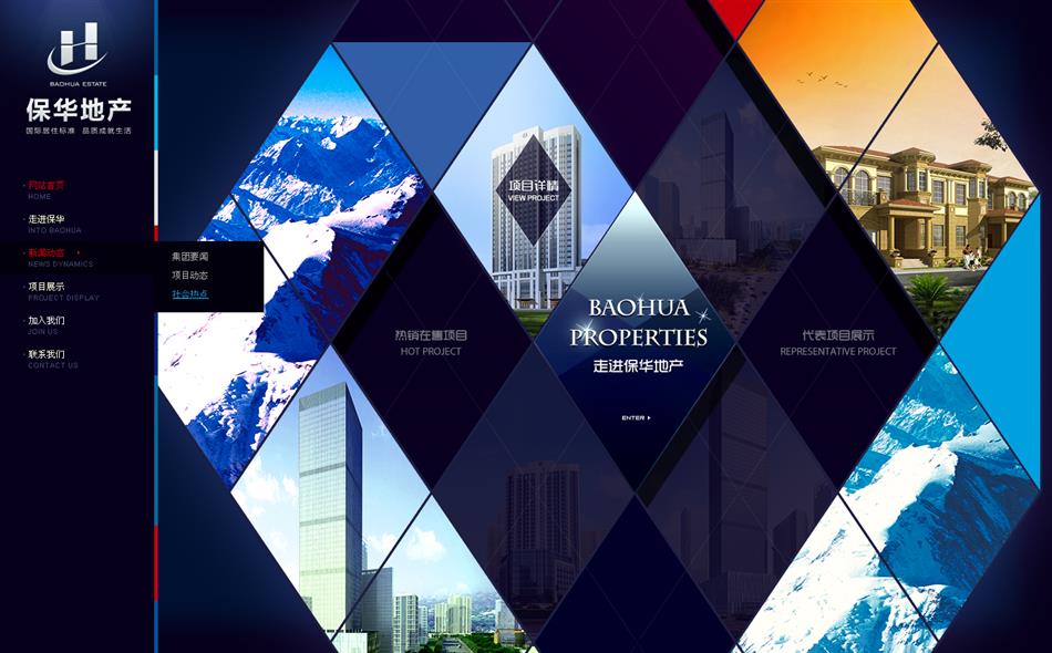 寶石藍色與金色的搭配,滿足客戶對網(wǎng)站主題顏色的要求,引導頁采用JS特效實現(xiàn)flash效果,業(yè)務范圍和地產(chǎn)項目平鋪展示,使得用戶在瀏覽的過程中快速直接的找到對應的需求。